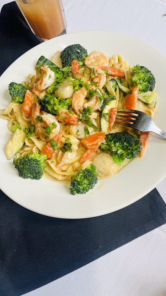 Egg noodles, shrimp, scallops, broccoli, carrots and pimento with Alfredo sauce.