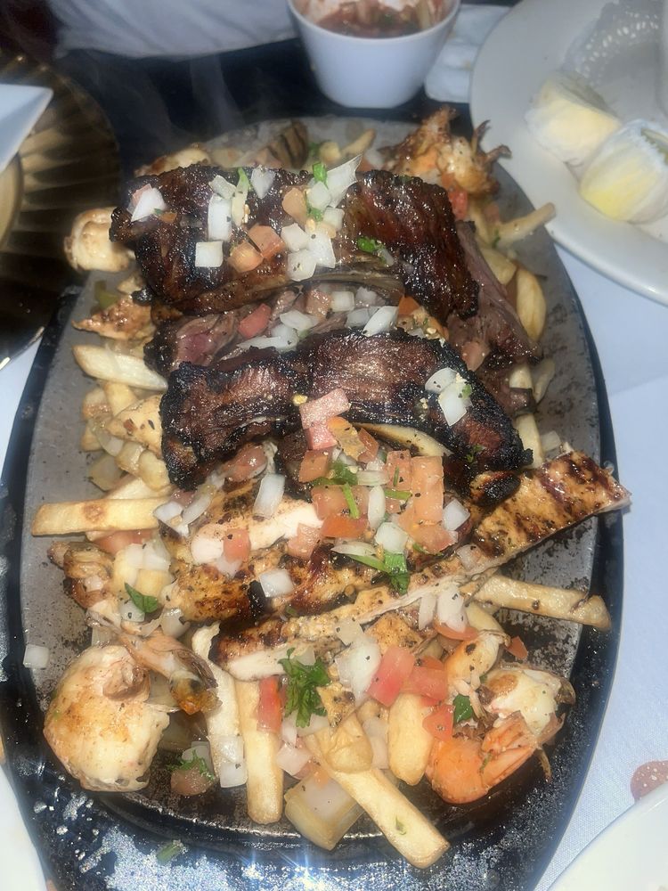 Beef, chicken, ribs, shrimp, yuca, onions and pico de gallo.